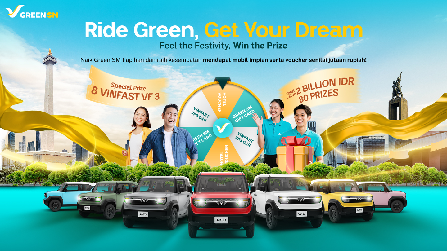 Setiap kali menggunakan taksi listrik Green SM, pelanggan tidak hanya mengurangi jejak karbon, tetapi juga berkesempatan memenangkan hadiah total Rp2 miliar, termasuk 8 unit mobil listrik VinFast VF 3, voucher menginap di hotel mewah, dan puluhan hadiah eksklusif lainnya.