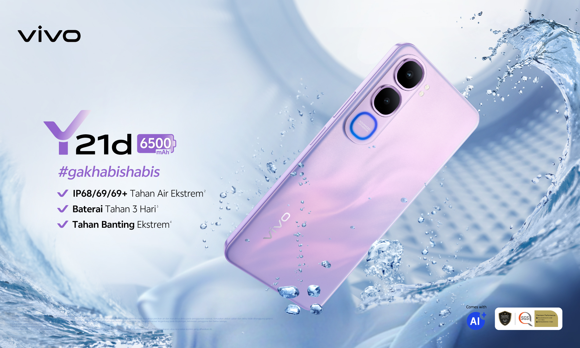 Vivo menyuguhkan Y21D dengan baterai jumbo 6.500 mAh, sertifikasi IP69+, dan kamera utama 50 MP, membidik konsumen yang menginginkan durabilitas tinggi.